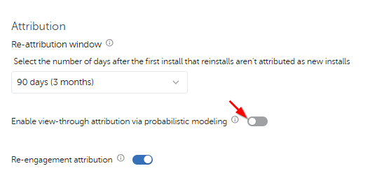 Go to the Attribution section and toggle on Enable view-through attribution via probabilistic modeling.