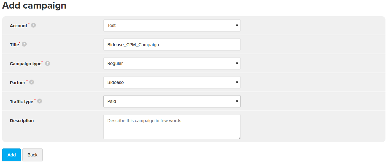 - Title: Enter the campaign name, e.g. Bidease_CPM_Campaign