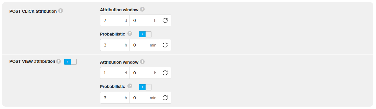- Ensure Probabilistic attribution is turned on for both Postview and Postclick attributions