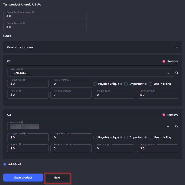 In the Tracking section, you can configure in-app events and define payouts based on CPA, CPI, CPM, or CPC models.