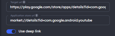 - Application Store URL: Use a Google Play deep link in the following format: market://details?id=PACKAGE_NAME. Example - market://details?id=com.google.android.youtube